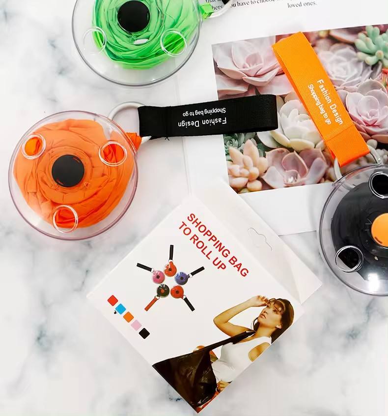 Reusable Roll Up Shopping Bag with compact foldable disc design for easy storage. Made from durable ABS and nylon, this lightweight grocery bag is waterproof, reusable, and perfect for shopping, travel, and daily use. The portable crossbody pouch allows easy carrying or attaching to keys, bags, or jeans. Simply pull the bag out from the round case and roll it back after use. Washable, space-saving, and eco-friendly, it’s an ideal reusable grocery tote for everyday convenience.